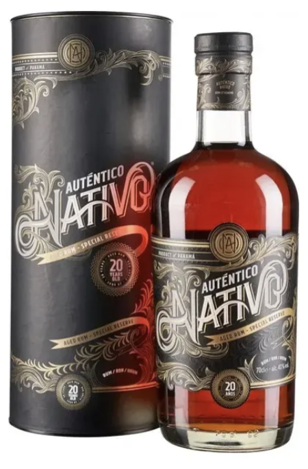 Ром Autentico Nativo 20 Years Old — вершина панамского ромоделия, Special Reserve с минимальной выдержкой 20 лет (с долей старше), крепостью 40%, объёмом 0,7 л, часто в подарочной упаковке. Произведён из тростниковой мелассы методом непрерывной перегонки в колонных аппаратах на дистиллерии Las Cabras, выдержан в бочках американского дуба ex-бурбон — глубокий, роскошный и многогранный, идеален чистым при 18–20°C как дижестив для особых поводов или с премиальными сигарами.