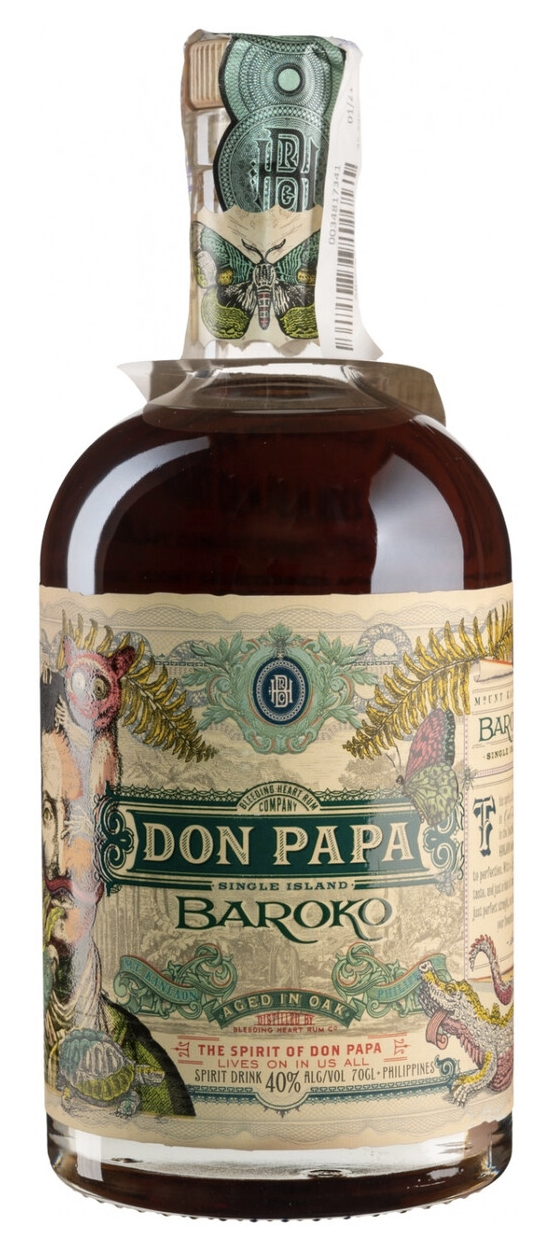 Ром Don Papa Baroko — премиальный филиппинский ром крепостью 40%, разлитый в бутылке 0,7 л, часто в подарочной упаковке или тубусе. Выдержанный 7 лет в бочках американского дуба из мелассы редкого тростника "Нобл", он отличается десертной сладостью с бархатистой текстурой — идеален чистым со льдом при 20–22°C или в коктейлях вроде Old Fashioned.