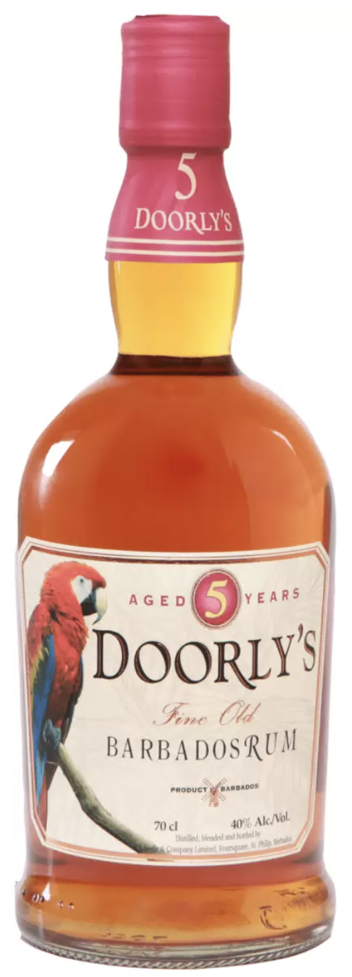 Ром Doorly's 5 Years Old — классический выдержанный ром с Барбадоса крепостью 40%, разлитый в бутылке 0,7 л в узнаваемой бутылке с попугаем. Выдержанный 5 лет в бочках из-под бурбона в тропическом климате, он сочетает фруктовую сладость с дубовой мягкостью — отличный выбор для чистой подачи со льдом или коктейлей вроде Dark 'n' Stormy.