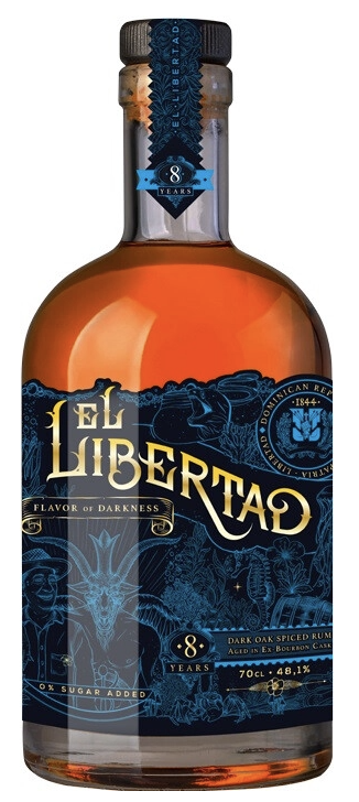 Ром El Libertad Flavor of Darkness Dark Oak Spiced 8 Years Old — премиальный пряный ром из Доминиканы крепостью 48,1%, объёмом 0,7 л, с тёмно-янтарным оттенком и мощным характером. Это промышленный ром из мелассы тростника, выдержанный 8 лет в старых бочках из белого американского дуба (ex-бурбон), с купажом 100% натуральных специй и оттенками хереса — интенсивный, древесный и сбалансированный, идеален чистым при 18–20°C как дижестив, со льдом или с десертами для ценителей сложных спайсов.