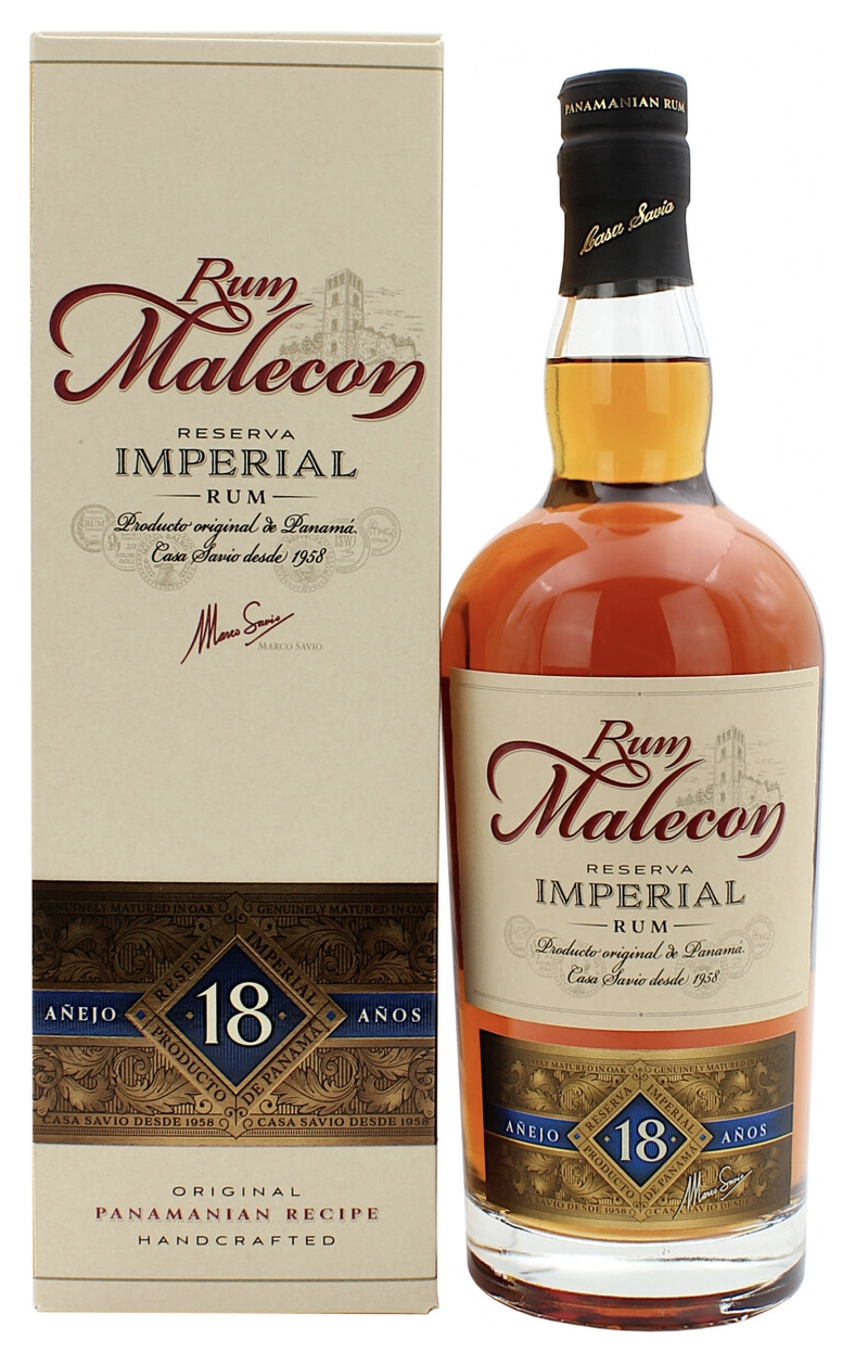 Ром Malecon Reserva Imperial Añejo 18 Años — премиальный выдержанный ром из Панамы крепостью 40%, объёмом 0,7 л, часто в подарочной упаковке. Произведён по кубанской традиции из мелассы сахарного тростника с 18-летней выдержкой в бочках из американского дуба ex-bourbon, он раскрывает сложный букет тропических фруктов и специй — идеален для чистого употребления при 18–20°C как дижестив или с сигарой.