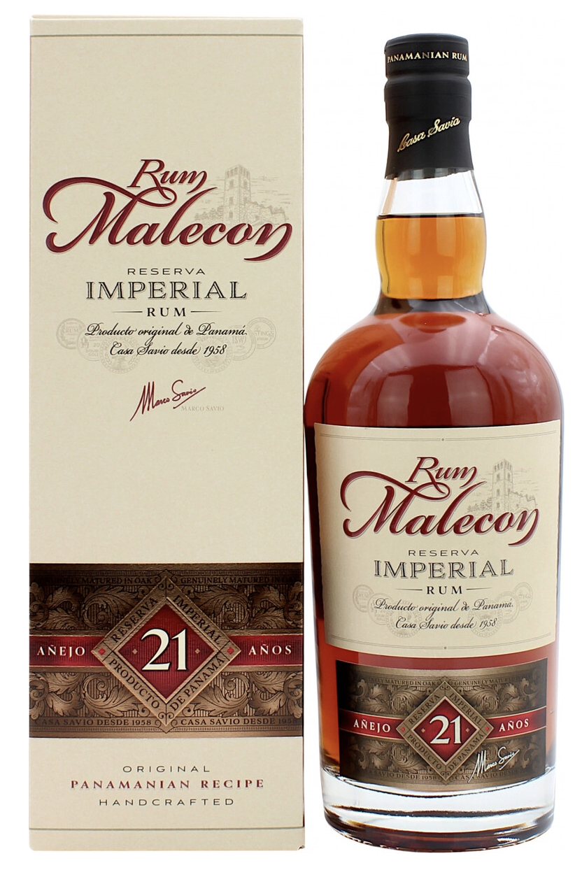 Ром Malecon Reserva Imperial Añejo 21 Años — вершина панамского ромового искусства, выдержанный 21 год крепостью 40%, объёмом 0,7 л, часто в подарочной упаковке. Созданный по кубинской рецептуре из мелассы экологически чистого тростника, он поражает глубиной и мягкостью — идеален чистым при 18–20°C как дижестив для ценителей или в паре с премиальными сигарами.