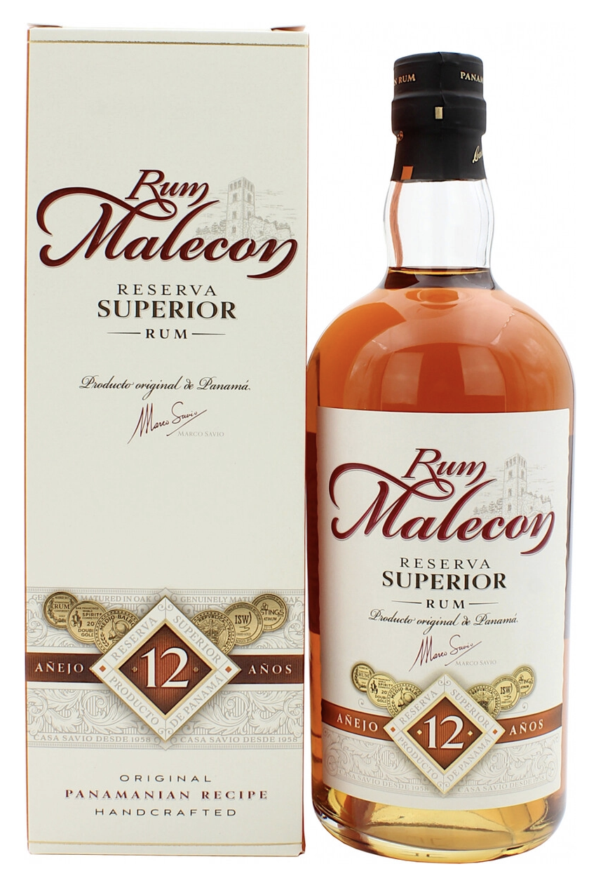 Ром Malecon Reserva Superior Añejo 12 Años — элитный выдержанный ром из Панамы крепостью 40%, объёмом 0,7 л, в стильной подарочной упаковке. Созданный по аутентичному кубинскому рецепту из мелассы экологичного тростника, он сочетает бархатистую сладость и пряные дубовые ноты после 12 лет выдержки — идеален чистым при 20–22°C как дижестив или со льдом для ценителей.