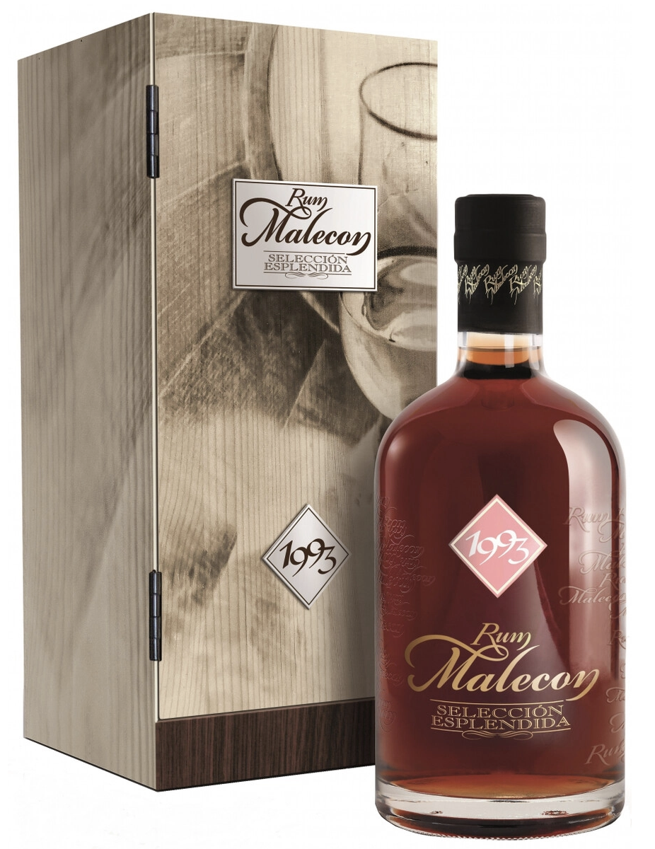 Ром Malecon Selección Espléndida 1993 — легендарный винтажный ром из Панамы крепостью 40%, объёмом 0,7 л, в эксклюзивной деревянной подарочной упаковке с индивидуальной нумерацией. Дистиллирован в 1993 году из мелассы премиального тростника по старинной кубинской традиции с 30-летней выдержкой в бочках из-под бурбона — коллекционный шедевр премиум-класса для эстетов, идеален чистым при 16–18°C как дижестив или с премиальными сигарами.