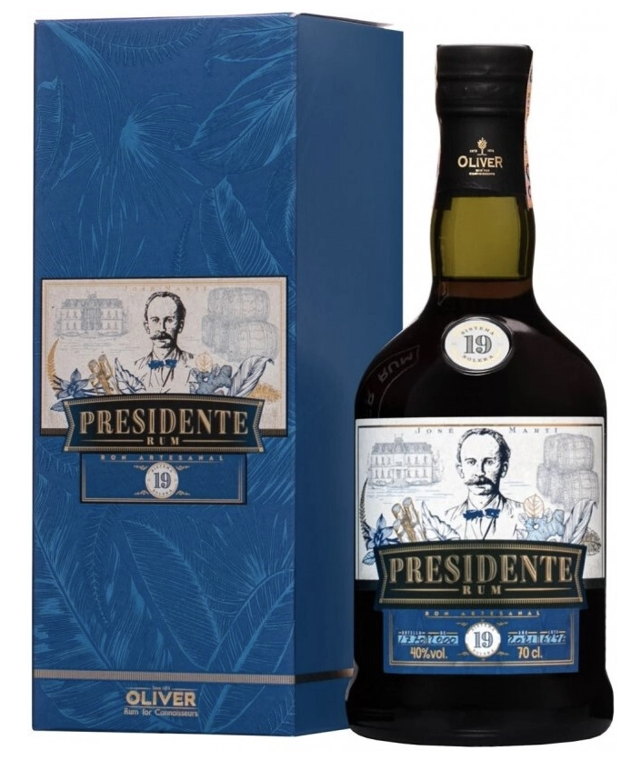 Ром Presidente 19 Años — коллекционный выдержанный ром из Доминиканской Республики крепостью 40%, объёмом 0,7 л, в подарочной упаковке. Назван в честь героя Кубы Хосе Марти, создан по кубинским рецептам XIX века с 19-летней выдержкой — сладкий, пряный и восхитительно гладкий, идеален чистым при 18°C как дижестив или в коктейлях.