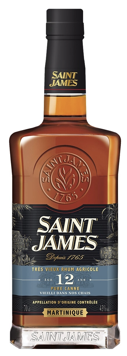 Ром Saint James Trés Vieux Agricole 12 Years Old — элитный выдержанный ром-агриколь с Мартиники крепостью 43%, объёмом 0,7 л, часто в подарочной упаковке. Произведён из свежевыжатого сока тростника по строгим стандартам AOC Martinique с 12-летней выдержкой в маленьких дубовых бочках — мощный и сложный, идеален чистым при 20–22°C как дижестив или с премиальными сигарами.