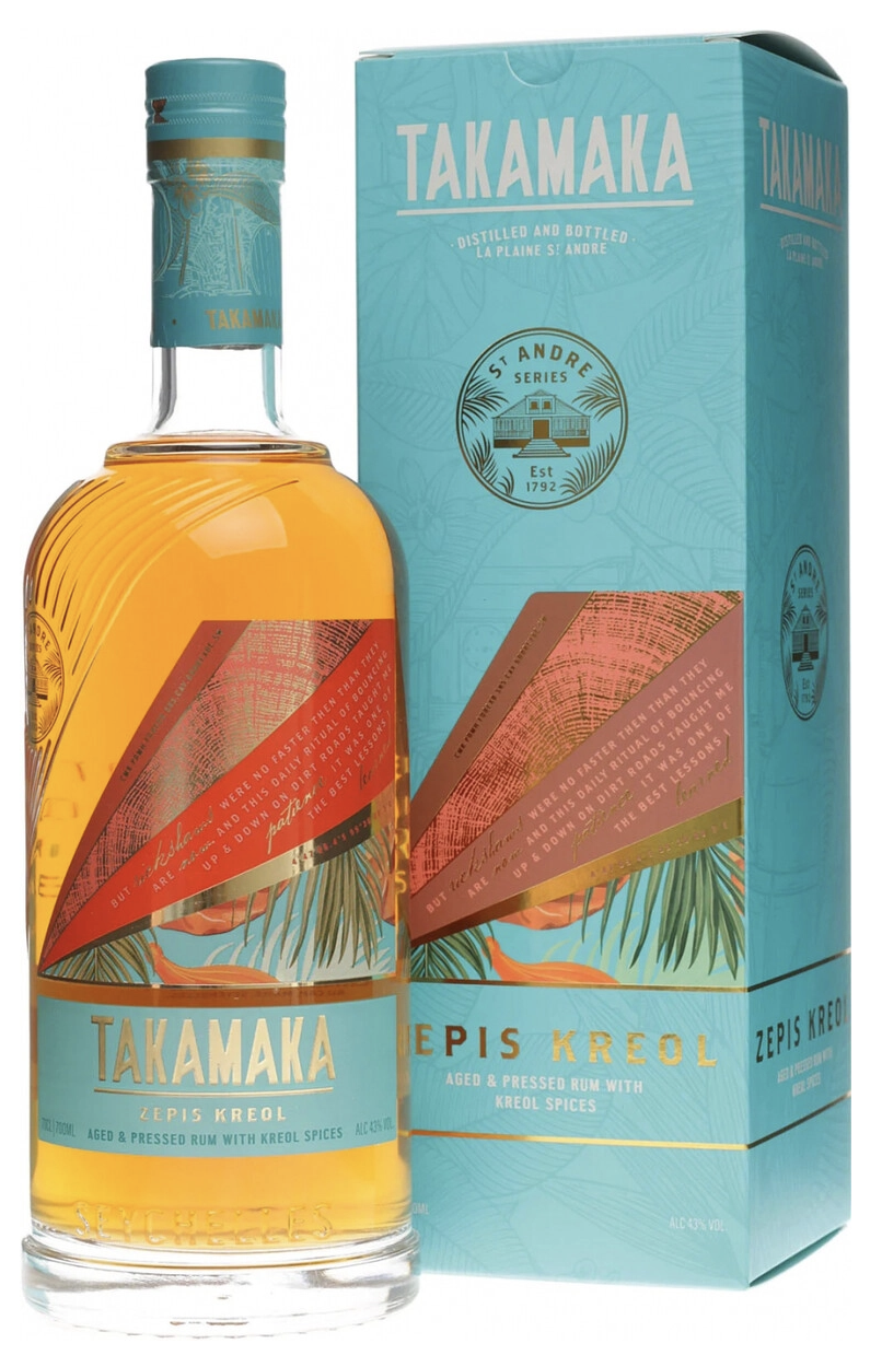 Ром Takamaka Zepis Kreol — экзотический пряный ром с Сейшельских островов крепостью 43%, разлитый в бутылке 0,7 л из серии Seychelles. Молодой ром из купажа пот- и колонных дистиллятов с местными специями и финишем в бурбоне, он сочетает тропическую сладость с креольской пряностью — идеален чистым со льдом при 16–18°C или в коктейлях вроде Hot Buttered Rum.