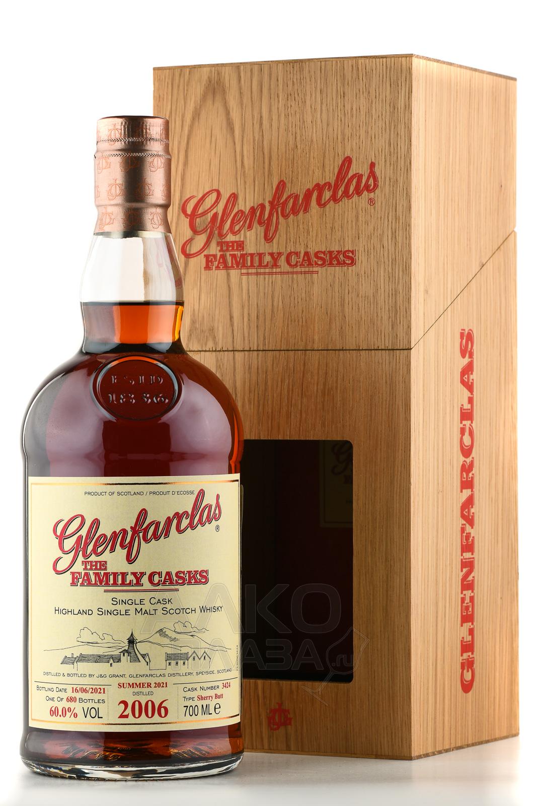 Виски Glenfarclas 2006 Family Casks — винтажный односолодовый шотландский виски из коллекции Family Casks, дистиллированный в 2006 году и выдержанный 15–18 лет в одной хересной бочке (sherry butt). Крепость 60–61.4% ABV без холодной фильтрации и красителей, лимитированный выпуск (~600 бутылок на бочку) в деревянной коробке. Темно-янтарный цвет, мощный Speyside стиль с фруктовой сладостью и пряной структурой — коллекционный релиз для ценителей sherry bomb.