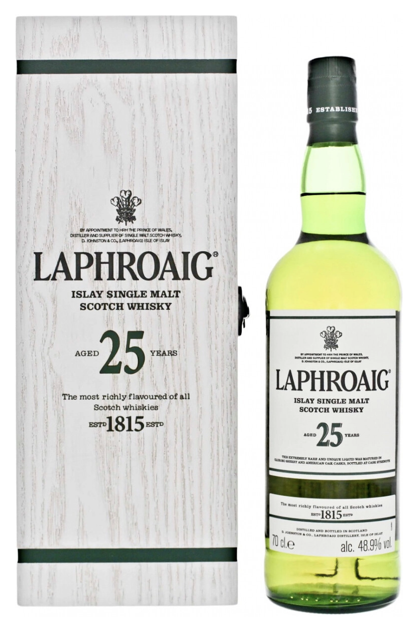 Виски Laphroaig 25 Years Old — это легендарный односолодовый шотландский виски с острова Айла, разлитый в бутылке 0,7 л с крепостью 48,9% (или до 51,4% в некоторых выпусках), часто в подарочной упаковке. Этот эксклюзивный 25-летний релиз сочетает культовую торфяную мощь Лафройг с утончённой зрелостью хереса и бурбона — вершина айлового стиля для медитативной дегустации или коллекции.