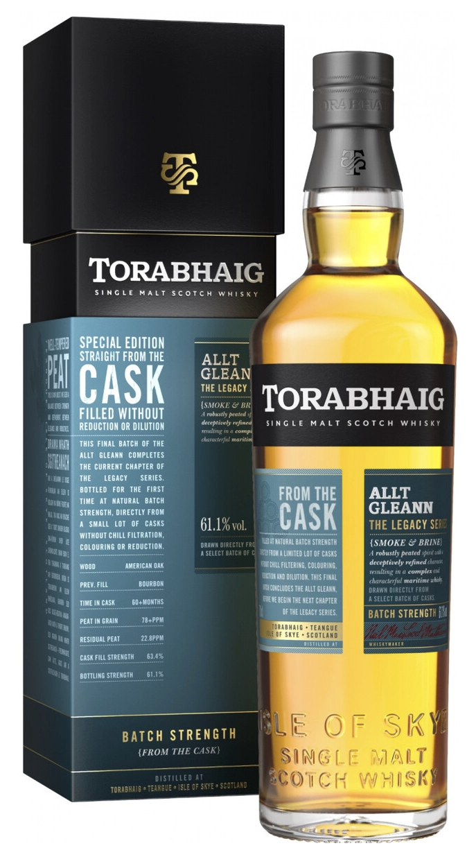 Виски Torabhaig Legacy Series Allt Gleann Batch Strength — это мощный односолодовый шотландский виски с острова Скай, разлитый в бутылке 0,7 л с крепостью 61,1% (cask strength). Финальный релиз Legacy Series (ограниченный тираж), отражает "юность" винокурни — пикантный торф (77 ppm фенолов в зерне, 22,8 ppm в напитке) с островным характером, идеален для ценителей интенсивного дыма и экспериментов с водой.